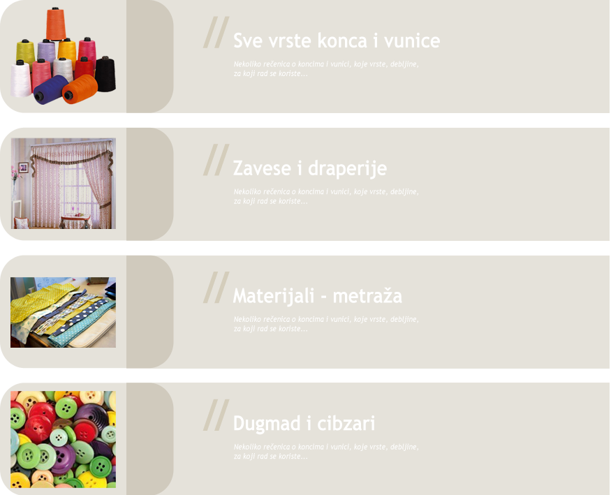 Osnovna delatnost ove firme je prodaja modne i dekorativne metraže i pozamanterije.